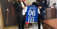 Beypazarıspor kulübü başkanı Öner Güler İlçe Emniyet Müdürü Murat DURSUN'u makamında ziyaret ederek Türk Polis Teşkilatımızın 181.kuruluş yıldönümü ve Polis Haftasını tebrik ettik. Bu vesileyle günün anısına kendisine Beypazarı Spor takımının formasını takdim etti.